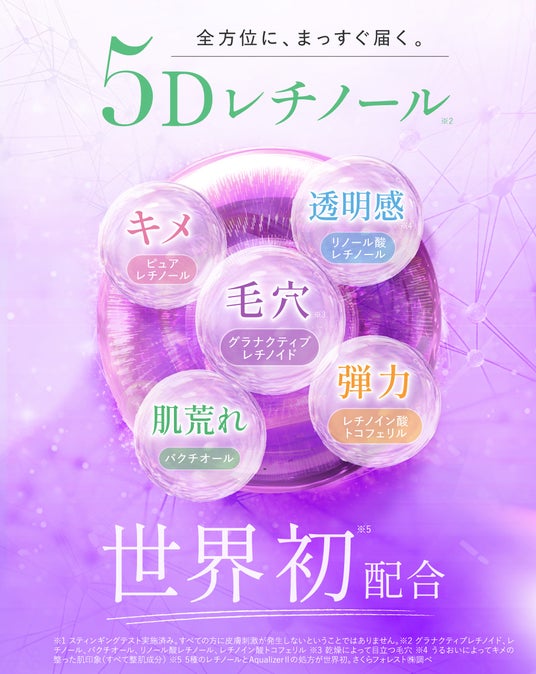 *1:5種のレチノールとAqualizer IIの組み合わせが世界初。さくらフォレスト(株)調べ。*2:グラナクティブレチノイド、レチノール、バクチオール、リノール酸レチノール、レチノイン酸トコフェリル(すべて整肌成分)*3:整肌成分 *4:乾燥によって目立つ毛穴 *5:2024年7月に実施した205名に対するアンケート結果に基づくデータ。さくらフォレスト(株)調べ。 *6:スティンギングテスト実施済み。すべての方に皮膚刺激が生じないということではありません。