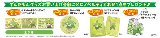 ■店舗にて『ずんだもん』関連商品をご購入いただいた金額に応じて、のんたお氏、坂本アヒル氏の描き下ろしデザインによる“オリジナルノベルティ(非売品)”どれか1点をプレゼント! *数量限定のため、無くなり次第終了いたします。