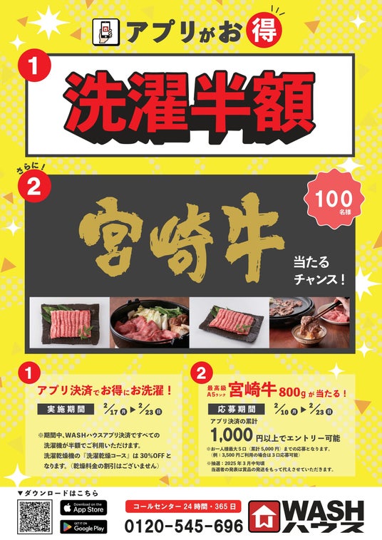 期間中、WASHハウスアプリで1,000円以上決済すると宮崎牛が当たるチャンス!今すぐWASHアプリをダウンロード!
