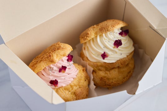 ジャージー生クリームをたっぷり使用したシュークリーム2種類 (右:薔薇と苺シュー 650円 左:ルビーショコラシュー 750円)