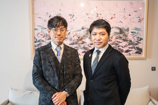 特別宿泊プランが提供される民泊施設『d3 HOTEL+』の館内にて、Study:大阪関西国際芸術祭 2025の総合プロデューサー鈴木氏(写真右)と、株式会社グレートステイ代表の大崎氏(写真左)Photo: SOH