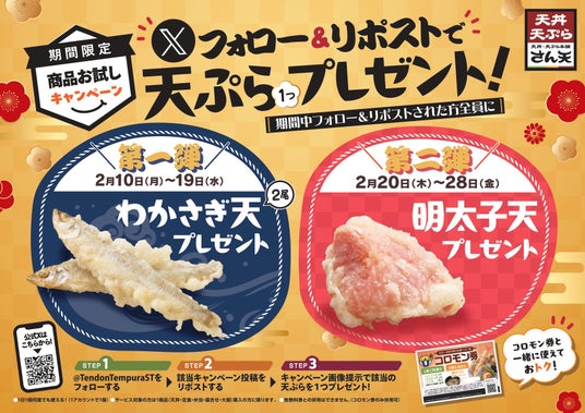 サトフードサービス株式会社(本社・大阪府大阪市、代表取締役社長・杉本 貴之)が運営する「天丼・天ぷら本舗 さん天」では、2025年2月10日(月)~2月28日(金)まで、公式Xで期間限定商品お試しキャンペーンを実施いたします。公式Xアカウントをフォローし、キャンペーン投稿をリポストすることで、第一弾の2月10日(月)~2月19日(水)まではほろ苦い旨みの「わかさぎ天(2尾)」を、第二弾の2月20日(木)~2月28日(金)まではピリ辛な「明太子天」がその場でもらえるキャンペーンを期間限定で開催します。簡単に応募でき、期間中に何度でも揚げたてサクサクの天ぷらがもらえる大変お得なキャンペーンですので、ぜひご利用ください。