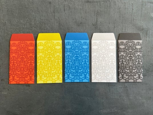 紋様研究室プロダクト:五色のぽち袋「鶴亀瑞喜富豊美」