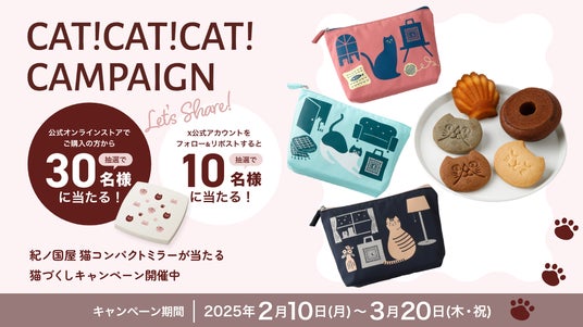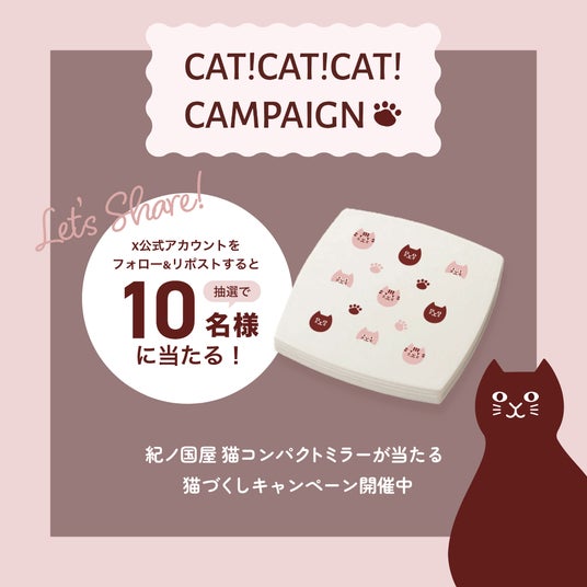 公式オンラインストアで対象賞品をご購入、もしくは公式Xのフォロー&リポストで、紀ノ国屋オリジナルの猫コンパクトミラーを総勢40名様にプレゼント!