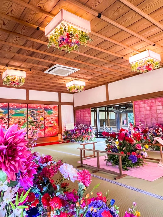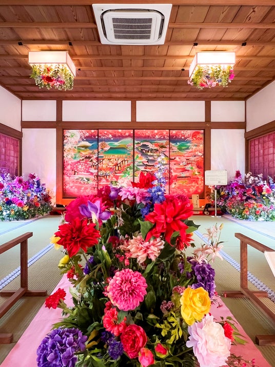 3月14日(金)までは隨心院内「能の間」にてJR東海との企画、花咲く京都『花の間』が同時開催中です。鮮やかな花々と襖絵「極彩色梅匂小町絵図」の共演は、ここでしか見て、感じることのできないフォトジェニックな空間です。また、3月31日(月)までは普段観ることのできない『如意輪観世音菩薩坐像』の御開帳も行いますので、観梅会にお越しの際は、こちらも要チェックです。