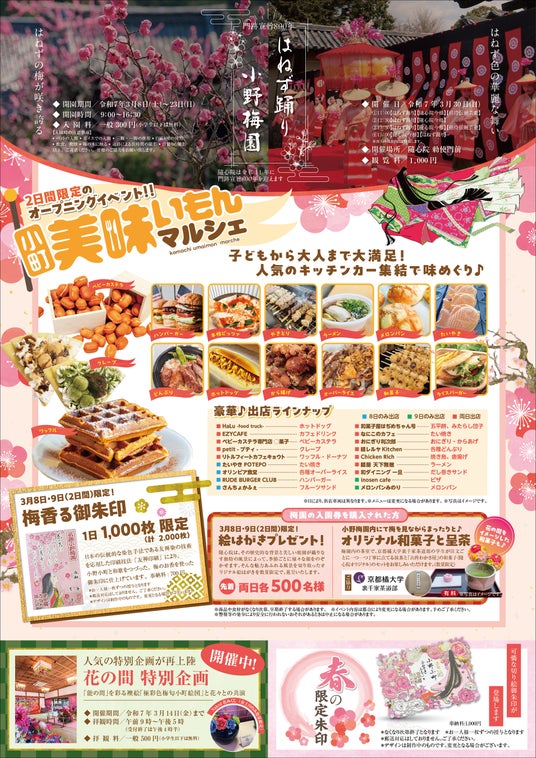 さらに3月8日(土)・9日(日)の2日間は梅園の開園を告げる観梅会のオープニングイベントとして、お一人でも、ご夫婦やご家族、カップルでも楽しい時間を過ごせる『小町 美味いもんマルシェ』を開催。多彩なバリエーションのキッチンカーが集まり、行楽季節の始まりを盛り上げます。この2日間のみ、梅のお香を使った「梅香る御朱印」も登場します。