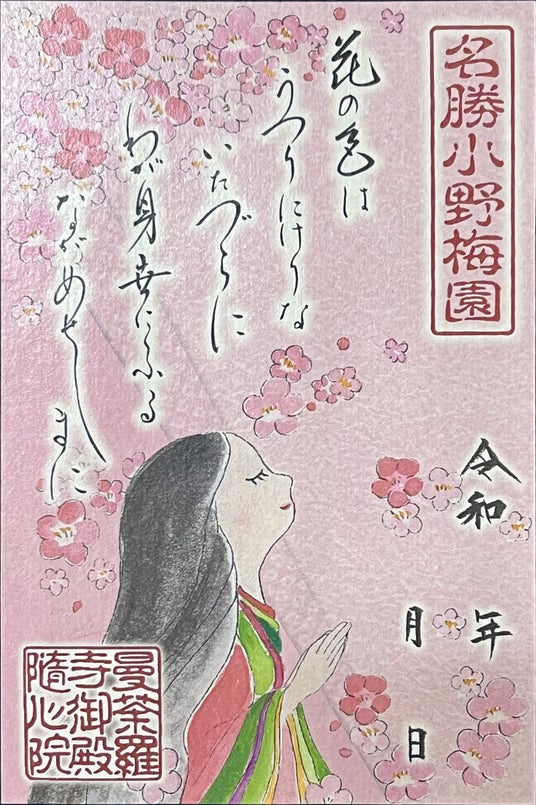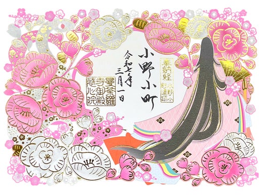日本の伝統的な染色手法である友禅染の技術を応用した印刷技法「友禅印刷」が映し出す淡いタッチの小野小町と和歌をつづった御朱印で、梅のお香を使用した香り付きの御朱印です。
