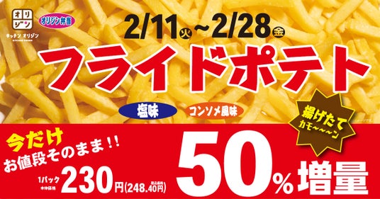 弁当・惣菜専門店「キッチンオリジン」「オリジン弁当」を展開しているイオングループのオリジン東秀株式会社(本社:東京都調布市/代表:後藤 雅之)は、2月11日(火)10時~2月28日(金)まで「お値段そのまま!フライドポテト50%増量フェア」を開催します。