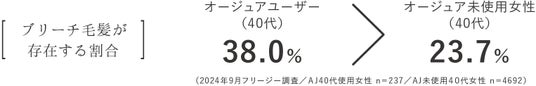 大人女性の中でも、ポスト団塊ジュニア世代(現40代女性が中心)が積極的にブリーチデザインを楽しむ女性達の割合が高く、特に、ヘアケアを行っているからこそデザインにも積極的なオージュアユーザーにおいては、毛髪のどこかに「ブリーチ毛髪」がある割合がオージュア未使用客と比べ高いこともわかっています。