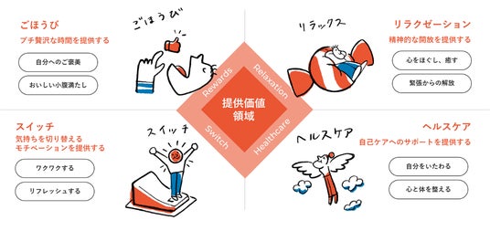 顧客起点を強化すべく、「ごほうび」、「リラクゼーション」、「スイッチ」、「ヘルスケア」の4つの提供価値領域を顧客起点で提供し、商品やサービス開発を通して顧客のSweetな瞬間をブランド基軸で創り続けることを目指します。