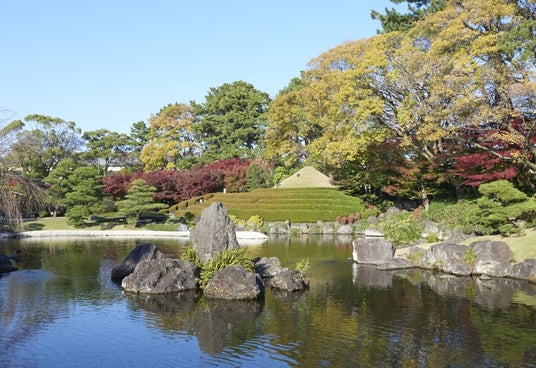 駿府城の遺構を今に伝える公園の中に位置する紅葉山庭園。大名庭園に見られるような遊楽、あそびの要素を基調とした庭園では、駿河の国の名勝を織り込んだ四季折々の表情を味わうことができます。茶畑に見立てたサツキの畝と芝に囲まれた築山は、駿河の国の象徴・富士山。この築山が庭園の中心となり、中腹の展望台からは庭園全体が見渡せます。庭園内には本格的なお茶を楽しめる立礼席もあります。