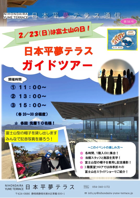 また、2月22日(土)~2月24日(振休・月)まで、3階展望フロアでは、今までスタッフが撮影してきた「日本平夢テラス」からの富士山の画像をスライドショーで紹介します。
