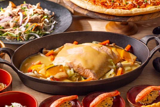 知床サーモンの白味噌ちゃんちゃん焼き知床産の新鮮なサーモンを使った北海道の名物料理。白味噌の優しい甘みとバターのコクが絶妙に絡む、野菜と一緒に焼き上げた一品です。