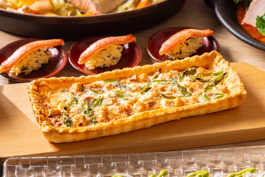 サーモンとアスパラガスのキッシュ新鮮なサーモンとみずみずしいアスパラガスをたっぷり使った、春にピッタリの爽やかなキッシュです。