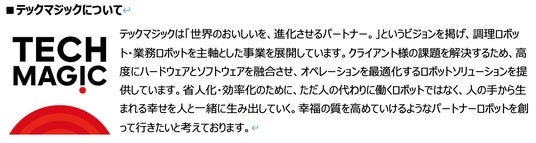 テックマジックは、2018年2月に設立。「ロボットテクノロジーで人類の幸せの質を高めていく」をミッションに掲げ、食を取り巻く多くの企業が直面する人手不足を解消し、人がより付加価値の高い業務に従事し、生産性の高い社会を実現するために、最新のAIやロボット技術を高度に融合した各種プロダクトの企画、設計、販売、保守を行っています。