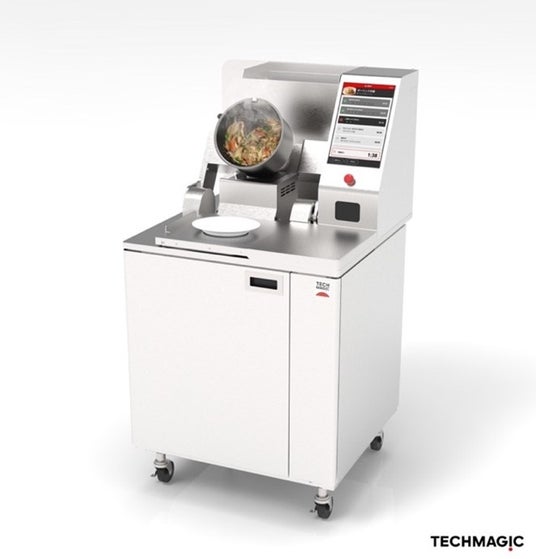 テックマジックが開発した調理ロボットI-Robo は、攪拌、加熱、調理後の鍋の洗浄といった一連の動作を自動化することができるロボットで、炒飯・野菜炒めなど、熟練の職人のレシピを自動で再現します。自動調理においては、メニューに応じて、加熱温度、加熱時間、鍋の回転スピード、回転方向を柔軟且つ適切に調整できます。I-Robo の導入により、人手不足の課題に対し省人化を推進し、人がより付加価値の高い業務に集中できる環境を目指します。