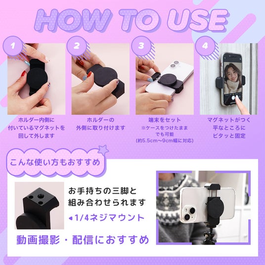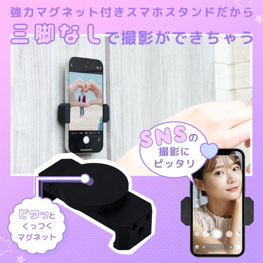スマートフォンマグネットホルダー iPhone Android 自撮り 写真撮影 動画撮影 配信 しっかりホールド 全1色 (MOT-SPSTD14)
