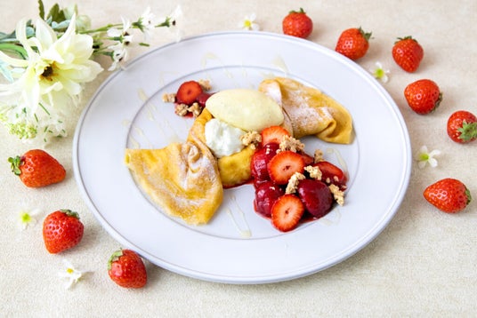 甘酸っぱいいちごにふわふわなフロマージュブランのクリームを合わせた季節限定クレープ。クルミとホワイトチョコレートクランチのザクザク食感とともにお愉しみください。