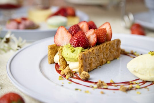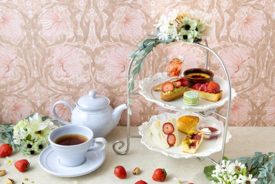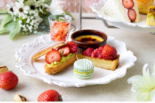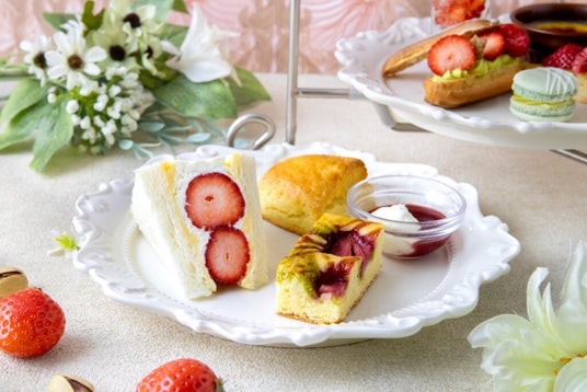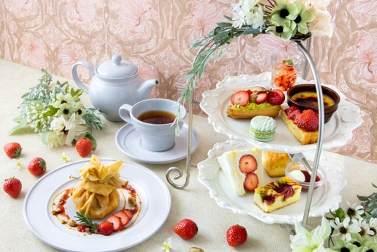 甘酸っぱいいちごとピスタチオのプティガトーで彩られたアフタヌーンティー。TOOTH TOOTHの紅茶とともに、素敵なティータイムを。