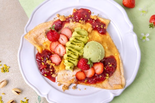 焼き立てのクレープ生地に、甘酸っぱいいちごと香り高いピスタチオクリーム、さらに濃厚なピスタチオアイスを添えて仕上げたピスタチオ好きにはたまらない季節限定クレープです。