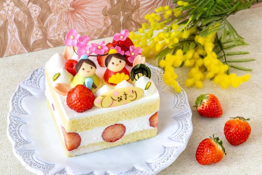 にっこりとほほ笑むお内裏様とお雛様をのせた、ひなまつりシーズン限定のホールケーキ。しっとりとしたジェノワーズ生地に、ほどよい甘さの生クリームと甘酸っぱいいちごをサンドしました。