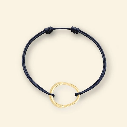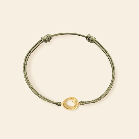 リヴィエラ SMブレスレット カーキコード。18Kイエローゴールドのモチーフとカーキコードが生み出す、シンプルで洗練されたデザイン。どんなスタイルにも自然に馴染み、大切な人との絆をさりげなく表現する一本。時を超えて愛される、タイムレスなアクセサリー。