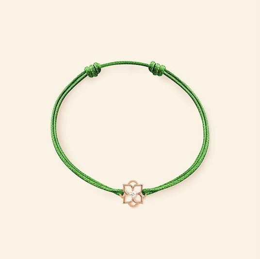 ミニジャルディーノ ブレスレット ダイヤモンド グリーンコード SM ブレスレット コード18Kピンクゴールドのモチーフに、0.06ctのダイヤモンドをあしらったコードブレスレット。深みのあるグリーンコードは、生命の躍動や自然の調和を象徴し、愛の成熟と深まりを表現します。自然の美しさと洗練されたジュエリーデザインが融合し、手元にそっと寄り添う一本です。
