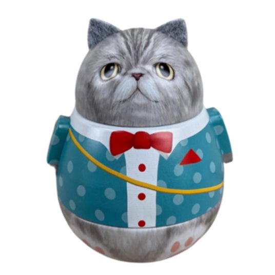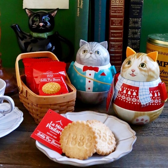 数量限定!かわいいキャット缶入りスイーツ猫の形の起きあがり人形缶です。英国シルバークレイン社製のかわいい猫の形をしたキャット缶に、ラ・メール・プラールのプチサブレが入っています。