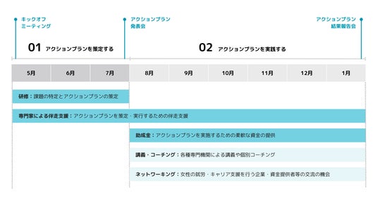 本プログラムでは、女性の就労・キャリア支援に関する最新の知見やトレンドを学びながら、専門家による研修や伴走支援、柔軟な資金提供、ピアラーニングを通じて、参加団体が事業を次なる段階へと発展・深化させるための中長期的な戦略をもとに、課題解決に向けたアクションプランの設計・実施を支援します。