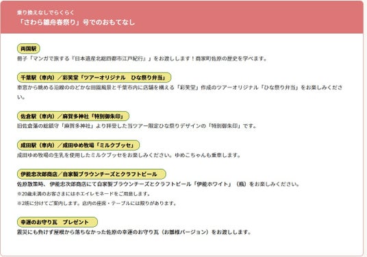 ○株式会社 JR東日本びゅうツーリズム&セールス(本社所在地:東京都墨田区)は、千葉県香取市佐原で開催されるイベント「さわら雛舟春祭り」にあわせて運行する「さわら雛舟春祭り」号・「ちばのいちご紀行」号を楽しむ日帰り旅行商品を発売しております。
