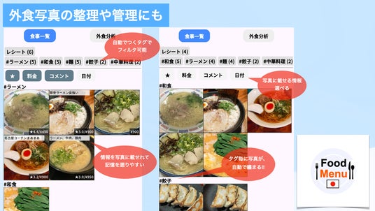 アプリでの写真整理画面。タグ(ラーメン、和食など)ごとに写真が分類。写真にコメントや評価、料金重ねて表示も可能。