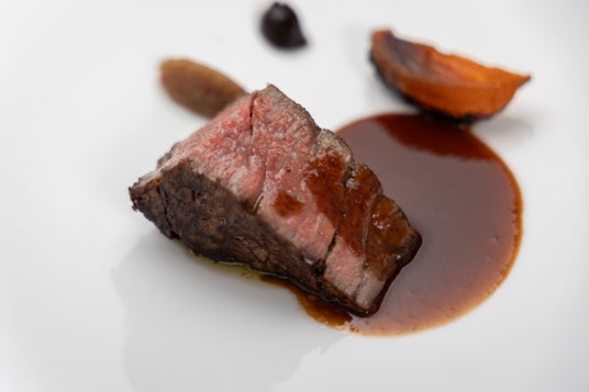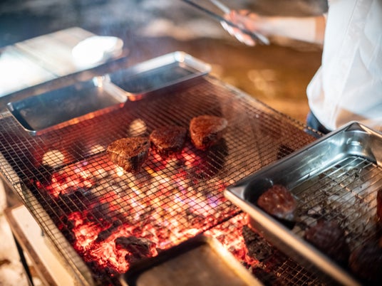 テーブルから見れる屋外キッチンで、薪火の調理法で焼かれたメインの和牛