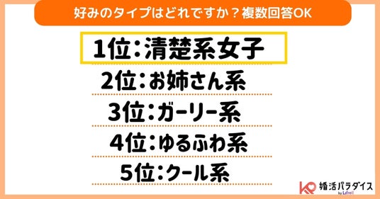 「清楚系女子」が最も多い回答を得た一方で、「お姉さん系」「ガーリー系」といったタイプも根強い人気があることがわかりました。