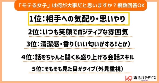 男性からは「相手への気配り・思いやり」「いつも笑顔でポジティブな雰囲気」が重要視されているという結果になりました。