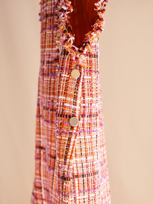 縦横に走る鮮やかなオレンジが印象的な生地に、