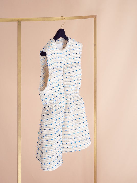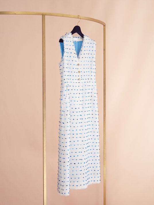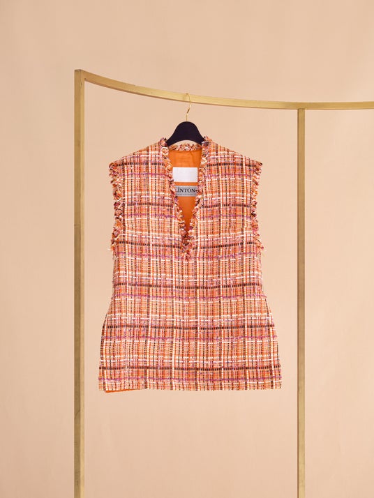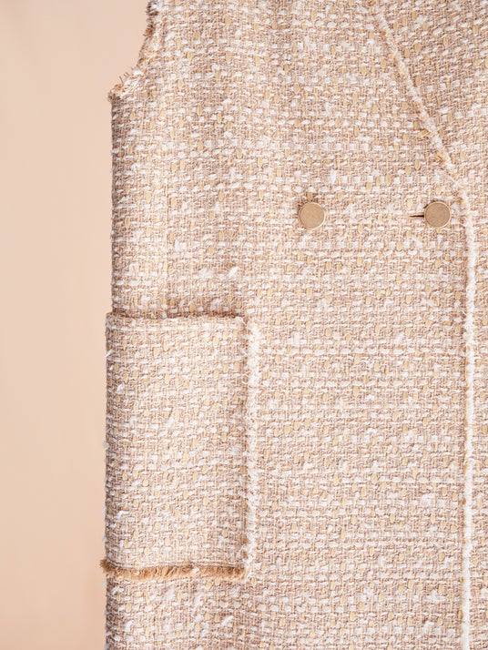 ジレは、このユニークな生地の魅力を最大限に生かしミニマルなシルエットに仕上げました。