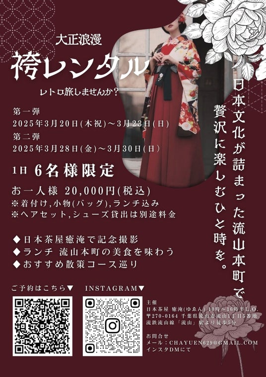 日本茶屋癒淹(本社:株式会社流山ツーリズムデザイン)は、【大正浪漫 袴レンタル レトロ旅しませんか?】を開催します。本イベントは、時代が移れど変わらない日本文化が詰まった流山本町を「歩いて、見て、触れて、味わって、楽しんで」新たな発見をご提供いたします。