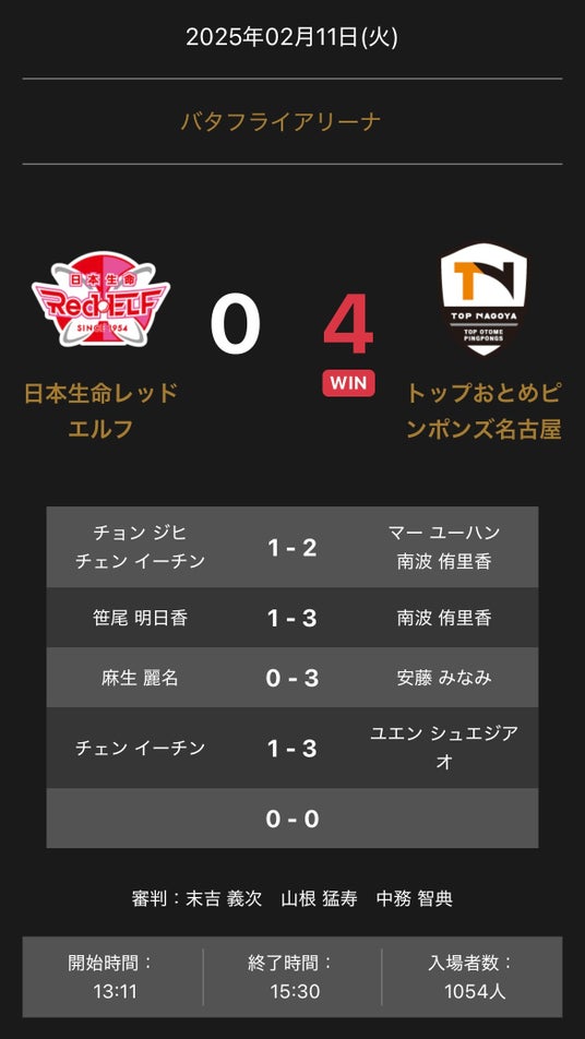 ノジマTリーグ 2024-2025シーズン 公式戦 2月11日開催 「日本生命レッドエルフ vs トップおとめピンポンズ名古屋」の試合は、4-0でトップおとめピンポンズ名古屋が勝利しました。