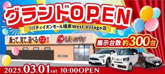 株式会社リバティ(代表取締役:蓮尾耕司、本社:京都市伏見区、以下「リバティ」)は、奈良県橿原市に『リバティイオンモール橿原 West Village店』を新たに出店いたします。今回オープンする店舗は3/1(土)より営業を開始し、3/1(土)~3/4(火)の期間で新店オープンフェアを開催いたします。