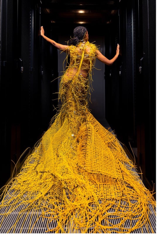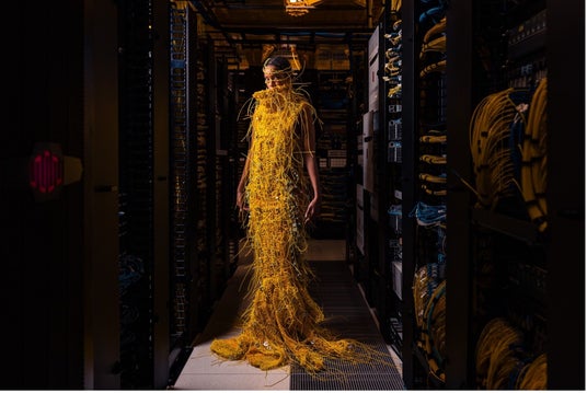 世界中のデータセンターには、このドレスの素材にも使われた光ファイバーケーブルをはじめ、重要なITインフラストラクチャが収容されています。データセンターは、企業、AIモデル、クラウドサービス、ネットワークプロバイダーなど、多様な組織が相互に接続し、データを交換する場でもあります。