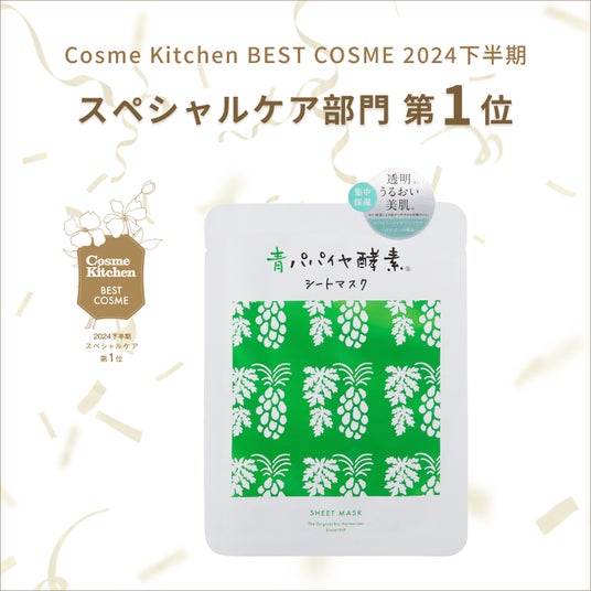 青パパイヤ酵素 シートマスクしっかりとした厚みで使いやすく、自然由来の美容成分をたっぷりと含んだオーガニックコットンシートのフェイスマスクです。オーガニック認証取得済のコットンを使用し、エイジングケア(※1)をサポート。肌に優しく密着し、たっぷりのうるおいで肌を整えます。