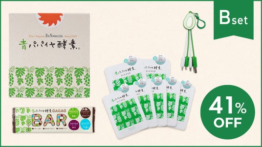 Cosme Kitchenが主催する「Cosme Kitchen BEST COSME 2024下半期」において最優秀賞を受賞した「青パパイヤ酵素 顆粒タイプ」、同スペシャルケア部門1位を獲得した「青パパイヤ酵素 シートマスク」とカカオバーが入ったBセット。さらに、本体部分が青パパイヤ型オリジナルデザインの3in1充電ケーブルのおまけ付き。