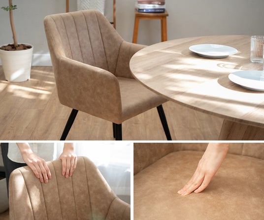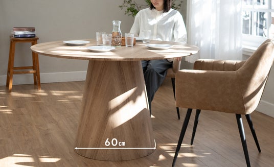 全員の顔が見渡せる円形デザインのテーブルで、自然と会話が弾みます。角のないフォルムが空間を広く見せ、小さなダイニングにもフィットします。チェアの肘掛けはテーブル下にスッキリ収まるので、使わない時はさらに省スペースに。