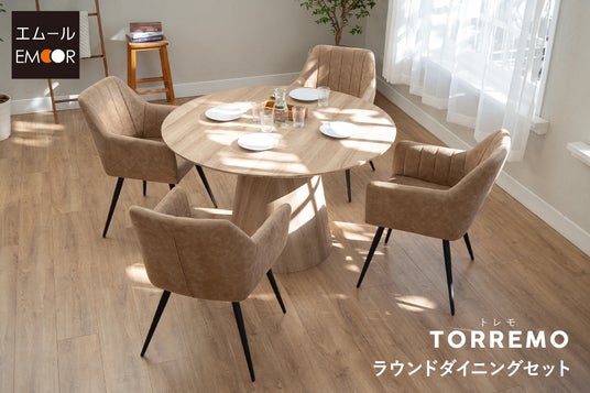 「身体に合った寝る・座る」を提供する健康家具ブランドEMOORを展開する株式会社エムール(東京都立川市:代表取締役 高橋 幸司)は、2025年2月10日より「TORREMO(トレモ) ラウンドダイニングセット(以下TORREMO)」の販売を開始しました。TORREMOは、美しい木目と洗練されたデザインを融合させた円形ダイニングテーブルと快適なチェアをセットしにしたダイニングシリーズです。