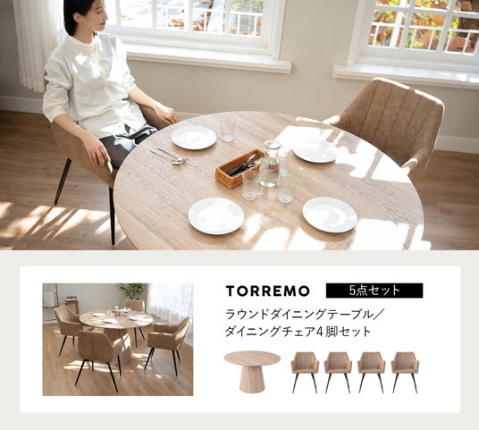 美しい木目の円形テーブルと洗練されたデザインの快適チェア4脚をセットにした、ラウンドダイニングテーブルセットTORREMO(トレモ)が新登場。ダイニングに温かな印象をプラスしませんか?
