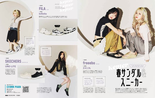 「Kep1er」のメンバー、ユジンさんとヒカルさんが履きこなす春サンダル&スニーカーをファッション誌「mini」でタイアップ掲載。全国のシュープラザ他各店舗と、公式オンラインショップで発売中。