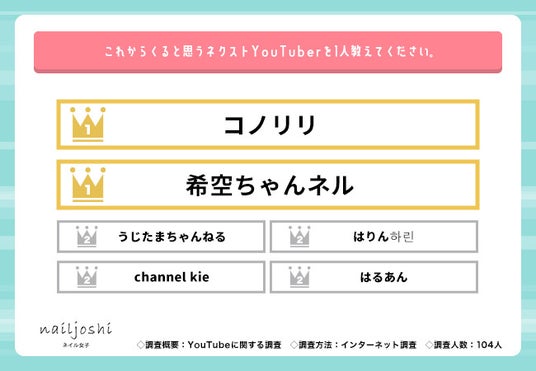 次に「これからくると思うネクストYouTuberを1人教えてください」と質問したところ、これから注目されるネクストYouTuberとして「コノリリ」と「希空ちゃんネル」が同率で1位にランクインしています。