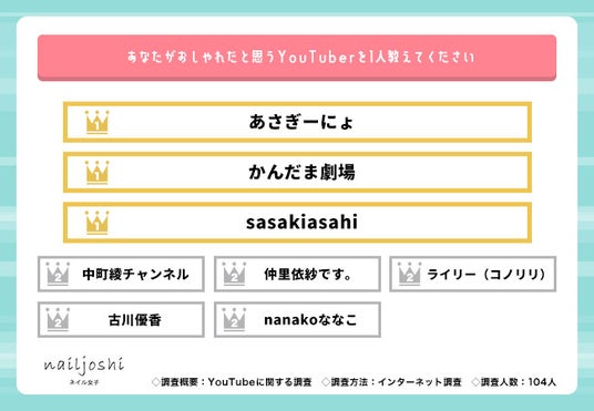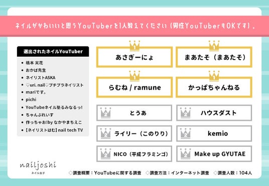 ネイルがかわいいYouTuberは「あさぎーにょ」「まあたそ(まあたそ)」「らむね / ramune」「かっぱちゃんねる」が最多回答数