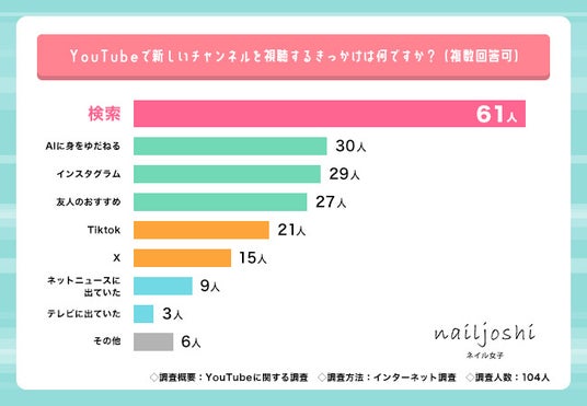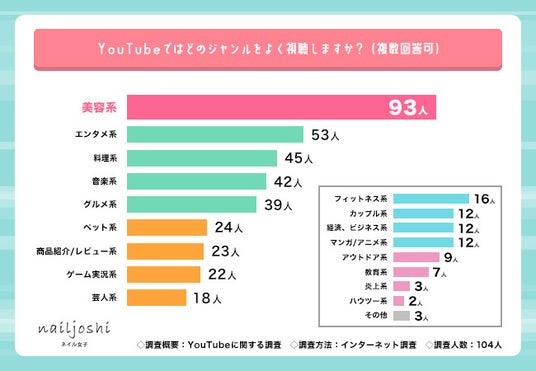 そこで今回、『ネイル女子』(https://www.nailjoshi.com/)を運営するアウトオブザボックス株式会社は、美容に興味があってYouTubeを見る20~30代の女性104名を対象にYouTubeに関する調査を実施しました。