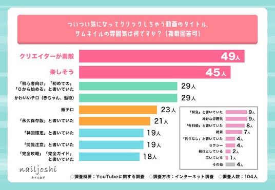 次に「ついつい気になってクリックしちゃう動画のタイトル、サムネイルの雰囲気は何ですか?(複数回答可)」と質問したところ、最も多くの支持を集めたのが「クリエイターが素敵」で49人でした。続いて「楽しそう」が45人、「『初心者向け』『初めての』『0から始める』」と「かわいいテロ(赤ちゃん、動物)」がともに29人となっています。興味を引くようなクリエイターの存在や、楽しげな様子がYouTube動画視聴のきっかけになっていることが多いようです。